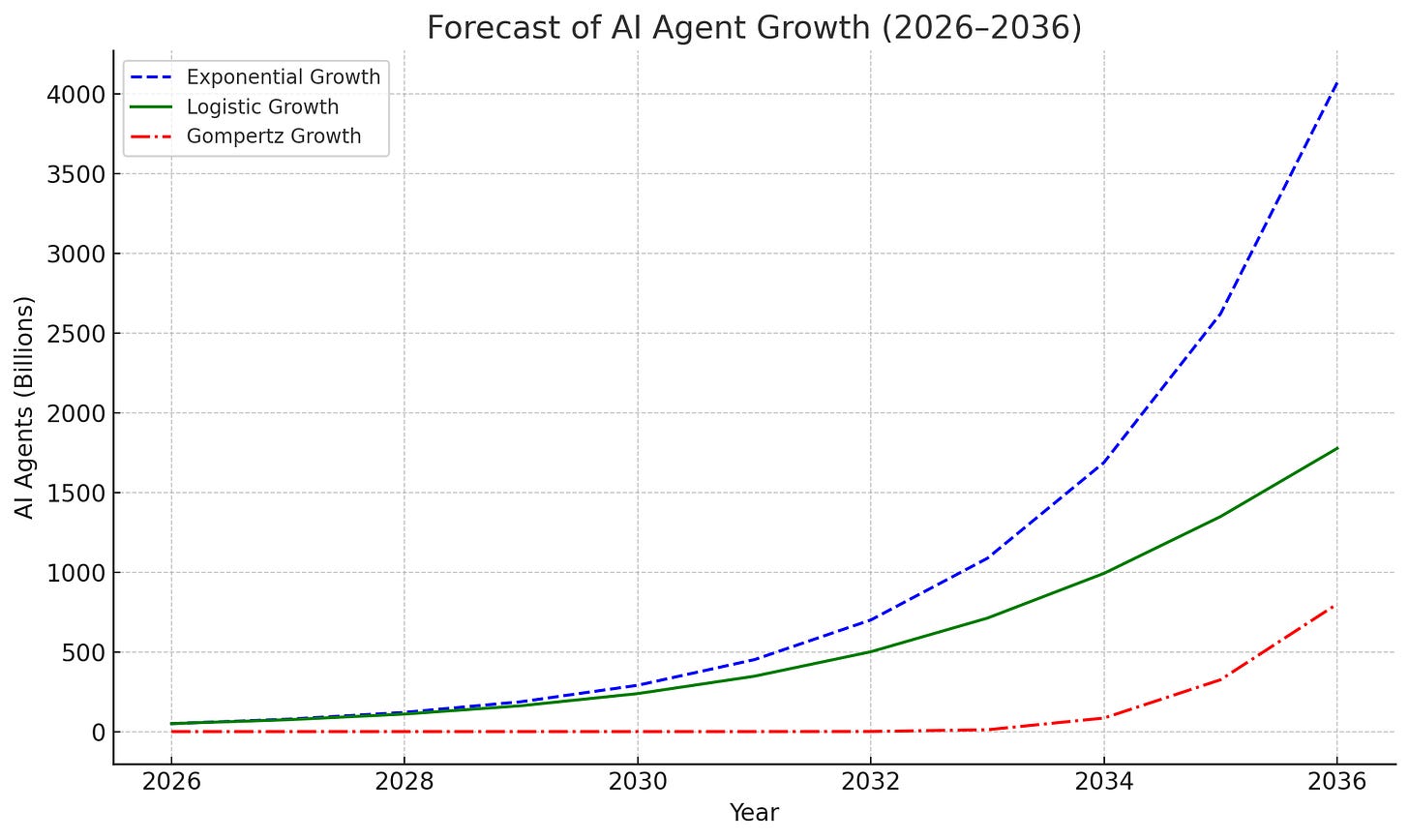 There is now published modeling work that treats agent proliferation as a scaling curve that can reach multi-trillion agent levels under plausible adoption dynamics. One recent paper on arXiv explicitly discusses models that approach a multi-trillion-agent scale, with growth that accelerates mid-decade and then slows as infrastructure becomes the bottleneck.